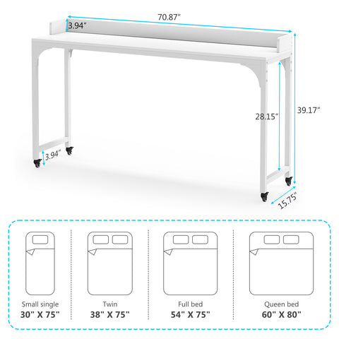 Measured 70.86’’L x 15.74’’W x 39.2’’H, it is much larger than any other overbed on the market and fits almost bed size from Twin 38*75 inches to Queen 60*80 inches. It's a real cross-bed table to allow you to enjoy your breakfast in bed blissfully. (Notice: Height can't adjust).